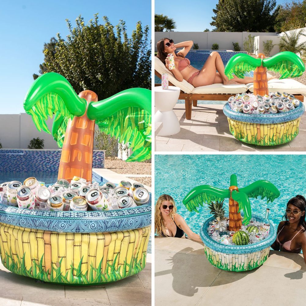 Or hosting a pool party with eye-catching decorations such as giant tank floats and inflatable palm trees.
