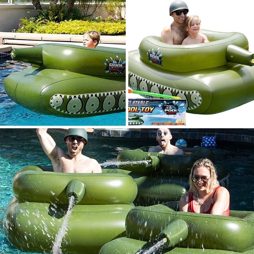 the Inflatable Tank Floatie features an incredibly detailed design that resembles a real tank, complete with turret, tracks, and camouflage pattern. It's perfect for military enthusiasts or those who simply want to add a touch of novelty to their poolside experience.