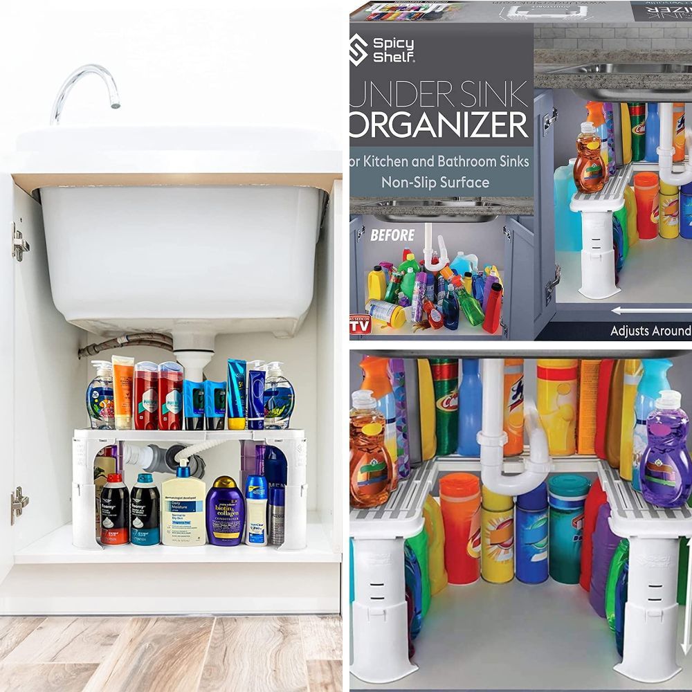 Utilize the often underutilized space under your sink with an expandable shelf organizer. It helps to create additional storage for cleaning supplies, dish soap, and other essentials, while keeping them neatly organized and easily accessible.