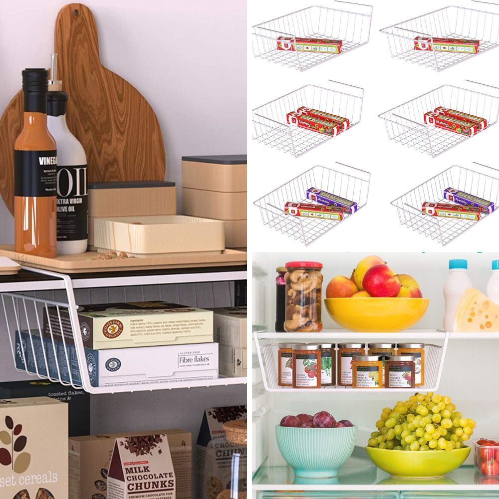 Make the most of unused vertical space in your cabinets with under-shelf basket organizers. They create additional storage for plates, bowls, cups, and other items, helping to declutter your shelves.