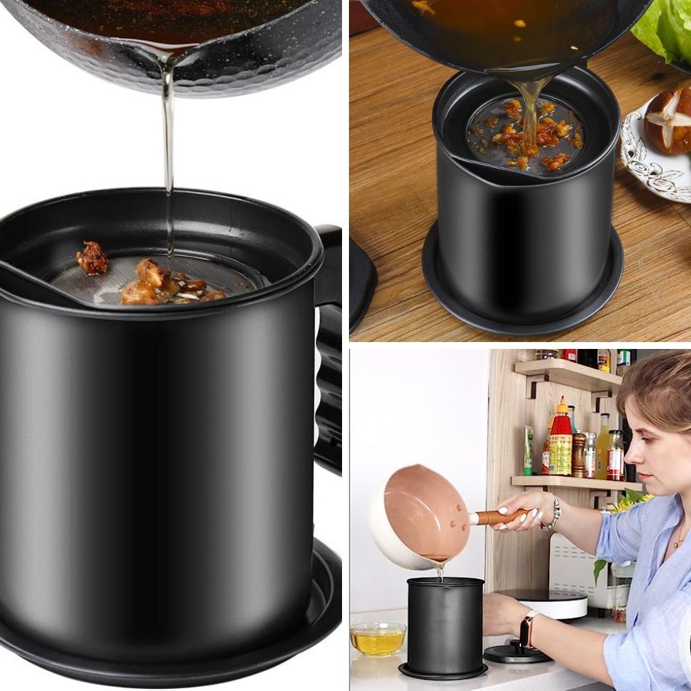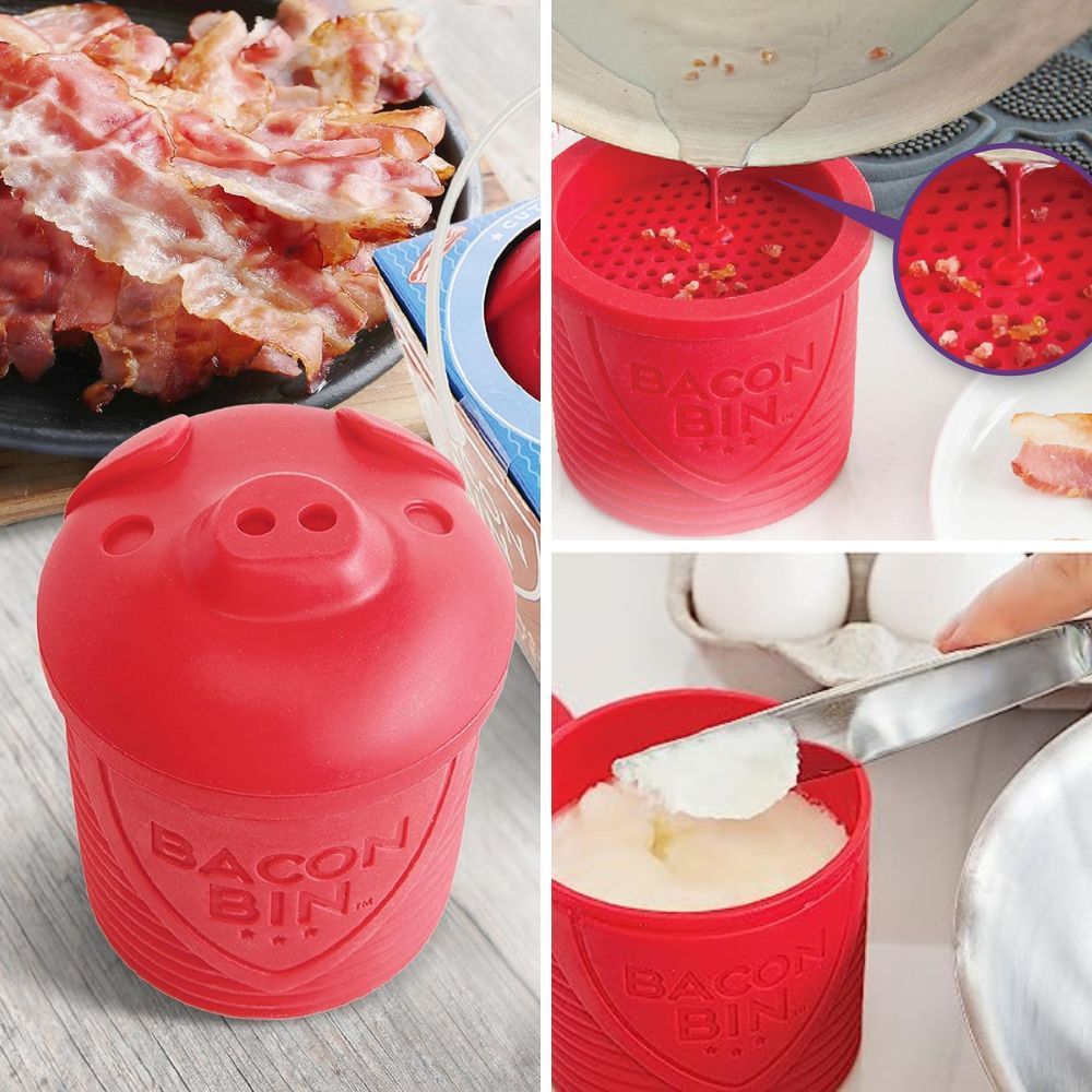 Bit Warden: Featuring a detachable sieve perched atop, this bacon grease custodian partitions minuscule bacon fragments from used grease. Now, you can sieve the swine's essence for future feasts or circumvent clogged conduits by processing grease ere it's swept away.