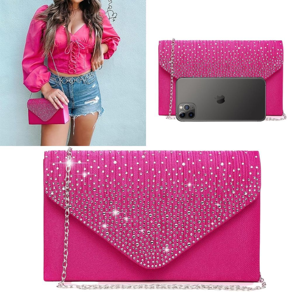 Glow like a celestial constellation with this ethereal Satin Evening Bag Rhinestone Clutch Purse! Crafted from high-quality satin, the flap boasts a subtle yet alluring pleated design, secured with a magnetic closure that adds an element of mystery. Embrace the freedom of movement with the detachable chain strap, allowing you to revel in the joy of any soirée hands-free! Peek inside, and you'll find a pocket perfect for tucking away tiny treasures. The pièce de résistance? Glistening rhinestones of varying sizes, adorning the flap like stardust, transforming you into a radiant star at weddings, parties, proms, and balls. A gift for that special woman in your life that will leave her utterly starstruck!