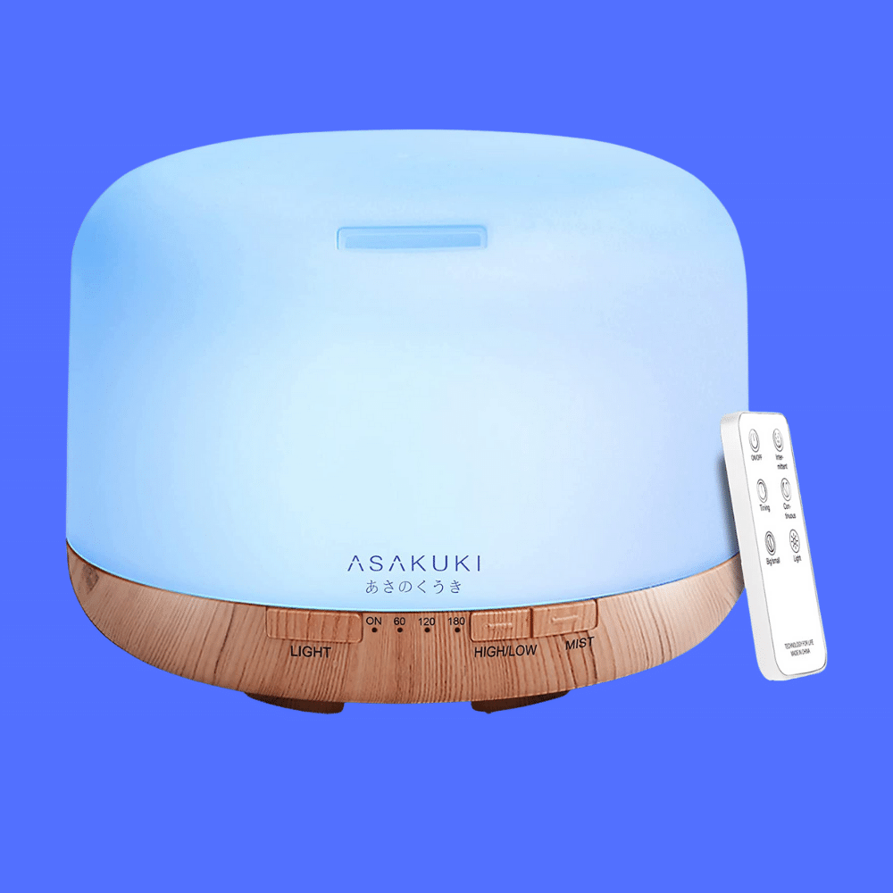 The ASAKUKI Premium Essential Oil Diffuser features a large and easy to clean 500ml water tank, 7 LED light colors, multiple mist nebulizer modes, and remote control.