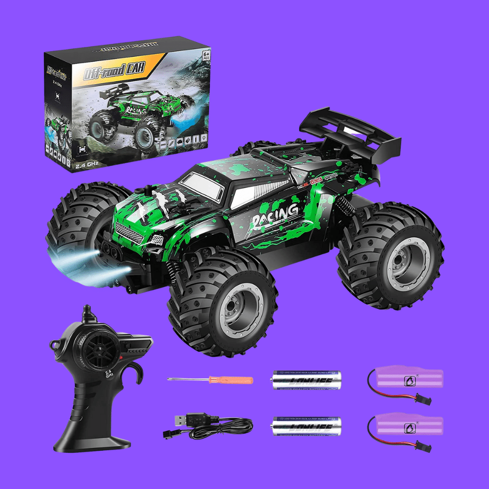 These toy cars can reach speeds of up to 50 mph and it comes with a 2.4 GHz transmitter for interference-free racing.