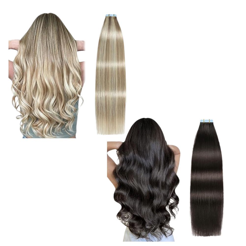 Dive into a realm where ordinary meets extraordinary, where every strand is a story untold. Enter the world of Full Shine Tape in Hair Extensions, where troubles melt away. Black tape-in extensions, the darlings of semi-permanent allure, are a feather-light embrace, gentle to your locks and scalp. They dance through 4-6 weeks of life, and the encore awaits.