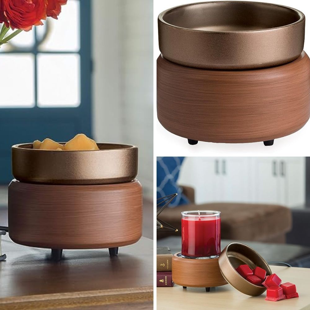 In a realm where elegance meets function, the CANDLE WARMERS ETC 2-in-1 Candle and Fragrance Warmer reigns supreme. A celestial fusion of golden bronze and walnut-like ceramic materializes into a functional work of art. With a detachable dish, it ushers in your favorite fragrance, whether in the form of melts, bricks, or tarts. Corded convenience and an illuminating dance accompany your indulgence. Versatile in its offerings, it embraces candles of up to 10 oz, while artisan melts cascade their exquisite scents. A symphony of form and function, it's an ode to luxury and craftsmanship.