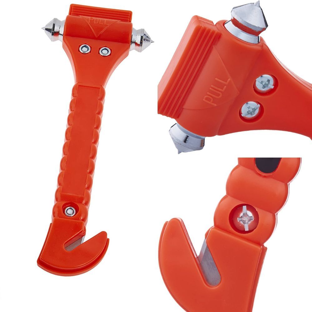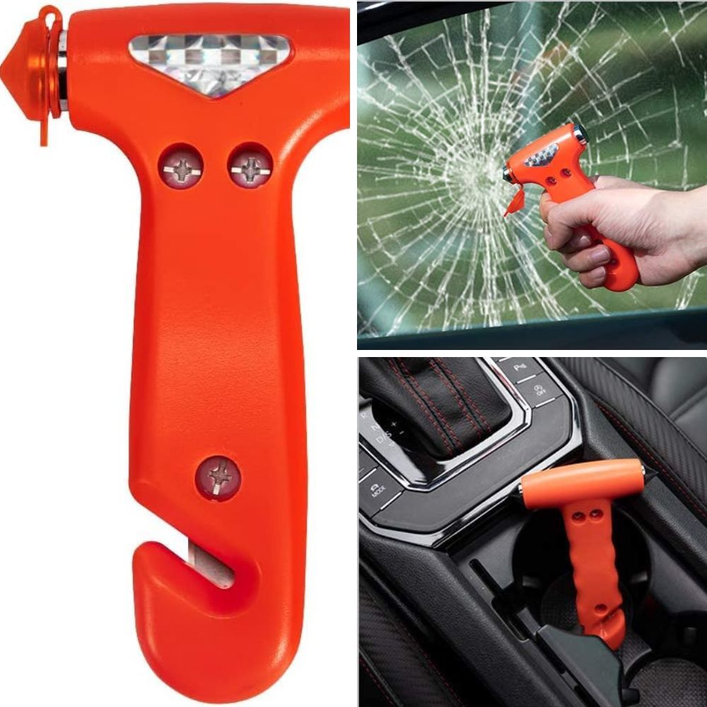 It features a hard tungsten metal double-head hammer for smashing car-door windows with ease, and a sharp blade for slicing through seat belts like a hot knife through butter.