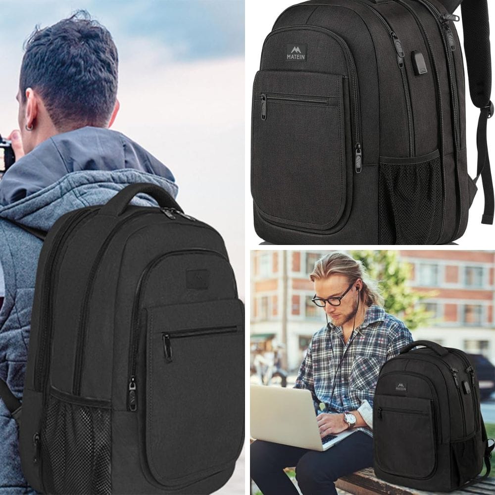Here we have the MATEIN Travel Backpack, the older, more sophisticated sibling in the MATEIN family. This backpack doesn't just carry your stuff; it organizes it like a personal assistant on your back. With compartments so smartly designed, you'd think they were crafted by organizational wizards, this backpack expands to hold more of your life than you thought possible. And with its built-in USB port, it ensures you're never more than a few inches away from powering up your gadgets. It's not just a backpack; it's a mobile command center for the modern nomad.