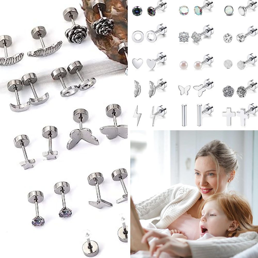 Enhance your earring collection with the 18 Pairs Stainless Steel Stud Earrings Set. This set offers a stunning variety of stud earrings, including rainbow cubic zirconia, opal, geometric designs, and more. Crafted from hypoallergenic stainless steel, these earrings are safe and comfortable for daily wear. With their polished and smooth surface, they are a fashionable choice for individuals with multiple ear piercings.