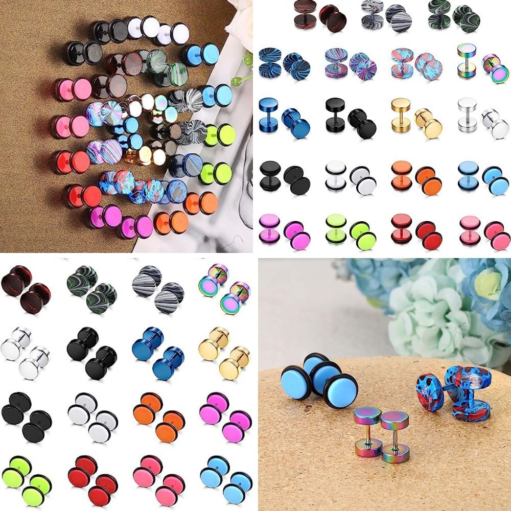 Unleash your rebellious style with the sailimue 19 Pairs Stainless Steel Men Earrings Studs Ear Piercing Plugs. This set includes 5 pairs of flat-back stud earrings, 6 pairs of patterned fake gauge earrings, and 8 pairs of acrylic barbell stud earrings. Crafted from high-quality stainless steel, these earrings are suitable for sensitive skin. Embrace your individuality and create your own style with these versatile and eye-catching earrings.