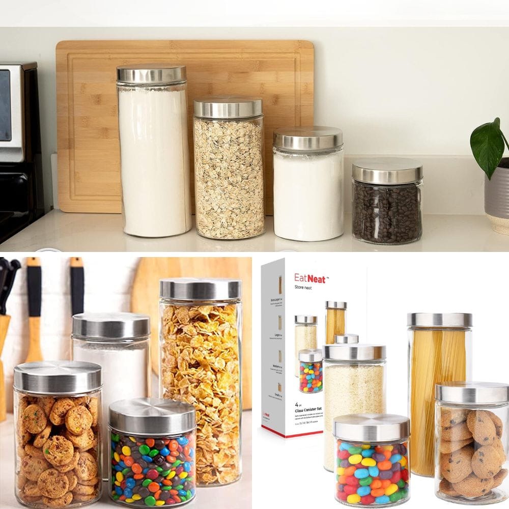 Meet your new kitchen allies, the EatNeat 4 Piece Glass Canisters. They're not just containers; they're like your kitchen's own transparent guardians. Made of tough-as-nails borosilicate glass, they're in it for the long haul. Imagine a container that doesn’t flavor your food with yesterday’s lunch; that's them! They’re the perfect blend of sleek design and everyday practicality, ideal for showing off your culinary collection with a bit of flair.
