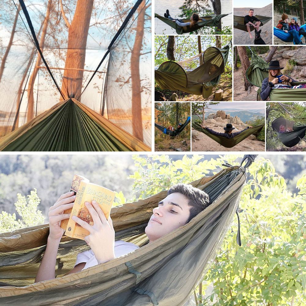 The G4Free Large Camping Hammock with Mosquito Net has got you covered.