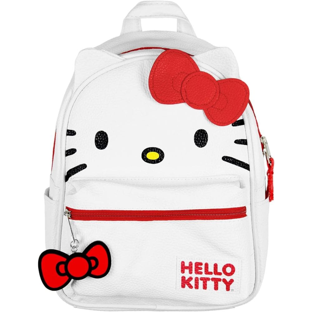 Behold the Hello Kitty Mini Backpack, where elegance meets the iconic in a symphony of design. This isn't just officially licensed Hello Kitty merchandise; it's a testament to the timeless appeal of our favorite feline. Dressed in textured white faux leather and adorned with a large face design, 3D ears, and a bow, this backpack doesn't just carry your essentials; it carries a legacy. With a main compartment for your treasures, a front zipper pocket complete with a red rubber bow charm for your secrets, and two side pockets for the mysteries of the universe, this backpack is a mini universe of wonders. Adjustable padded straps ensure that comfort is never compromised, making this the perfect choice for any Hello Kitty aficionado.