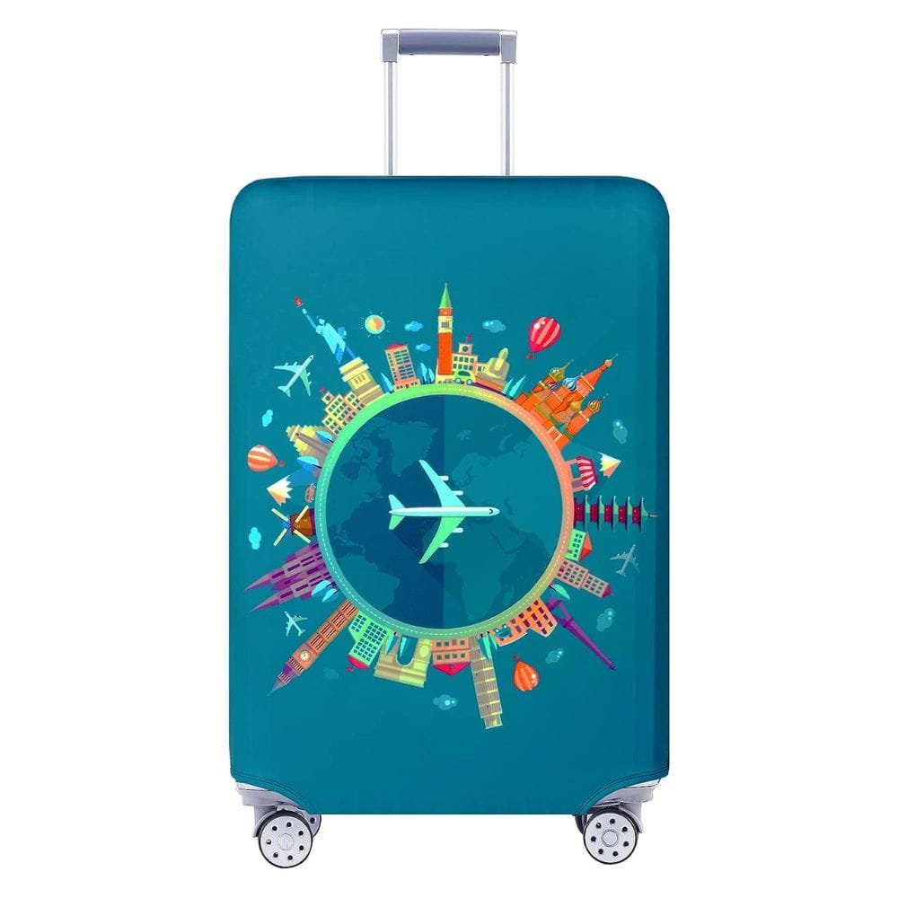 Next in our parade of protectors is the Explore Land Travel Luggage Cover. This one is less about blending in and more about making a statement. Decked out in a kaleidoscope of colors and patterns, this cover doesn't just protect your luggage; it transforms it into a beacon of your personality. Made of a robust mix of spandex and polyester, it stretches to fit snugly around your suitcase, ensuring that not only is it protected from the usual travel wear and tear, but it also becomes instantly recognizable on that endless airport conveyor belt.
