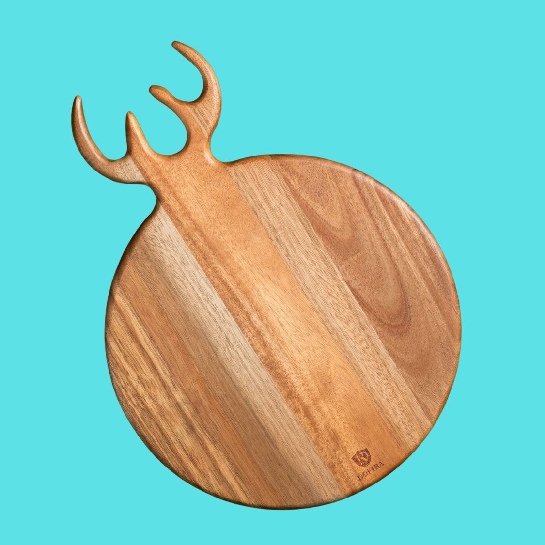 Invite nature into the kitchen with the Dofira Round Acacia Wood Cutting Board and Antler Handle!