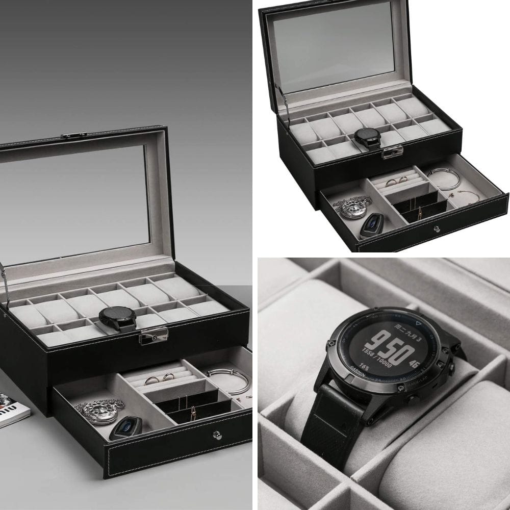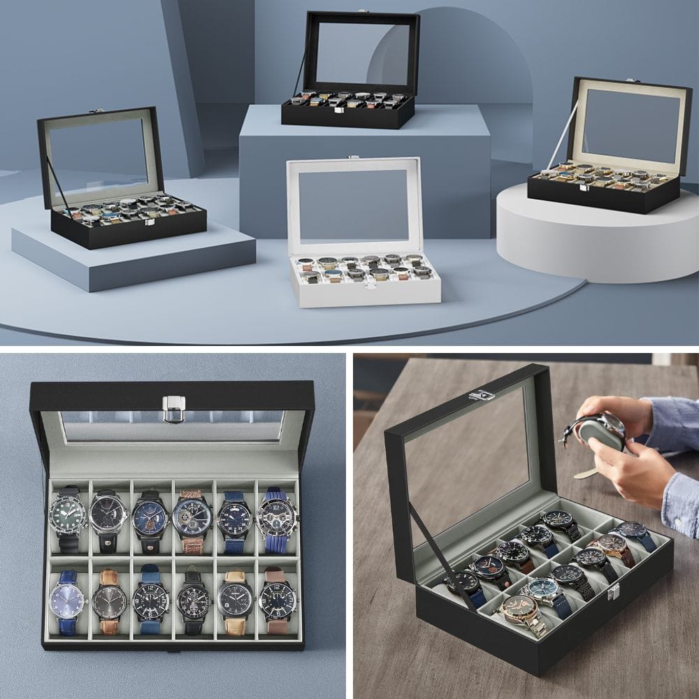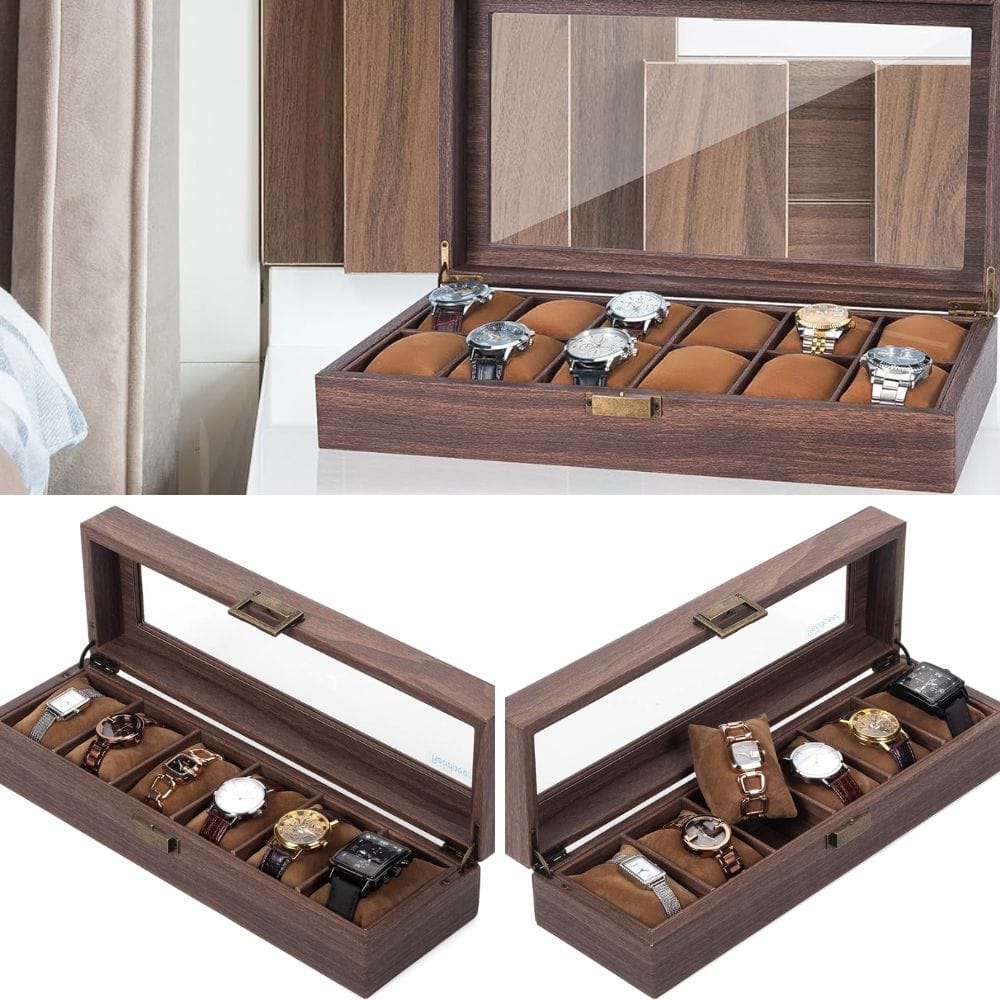 Moreover, the glass tops on these watch cases not only protect your watches from external elements but also allow for the easy viewing of your collections, making them functional and stylish display options. With features like lockable designs and adjustable slots, these watch cases cater to the varied needs of collections, ensuring that each "high end watch" is well-protected and beautifully presented.